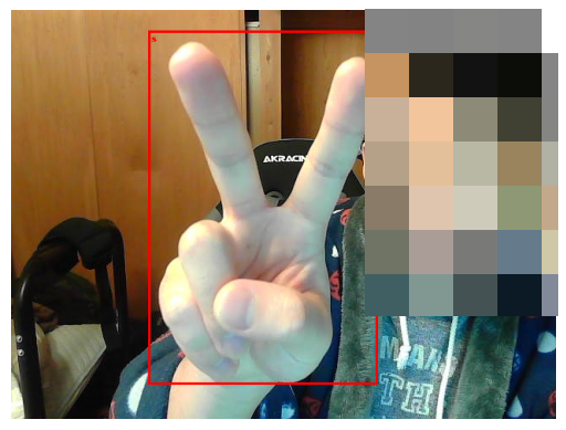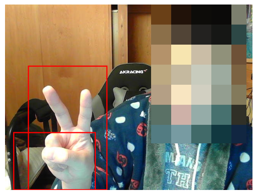 大きい枠はチョキと判定していて、小さい枠はグーと判定しています。
